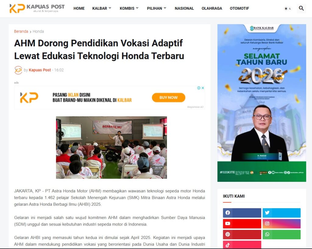 AHM Dorong Pendidikan Vokasi Adaptif Lewat Edukasi Teknologi Honda Terbaru by Muhammad Arif 12 Januari 2026 in Silahkan kunjungi https://www.kapuaspost.web.id/2026/01/ahm-dorong-pendidikan-vokasi-adaptif.html. Tags: astra Astra Motor kalbar Astra Motor Pontianak astramotor honda kalbar pontianak sepeda motor You Might Like Regional Public Launching New ADV160 The SUV Pride Grand Launching New PCX 160 Truly Exceptional! Tetap hati-hati ya bro sist berkendara saat hujan.