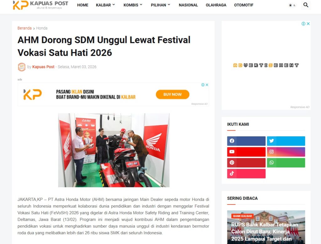 AHM Dorong SDM Unggul Lewat Festival Vokasi Satu Hati 2026 by Muhammad Arif 3 Maret 2026 in Silahkan kunjungi https://www.kapuaspost.web.id/2026/03/ahm-dorong-sdm-unggul-lewat-festival.html. Tags: astra Astra Motor kalbar Astra Motor Pontianak astramotor honda kalbar pontianak sepeda motor You Might Like Regional Public Launching New ADV160 The SUV Pride Grand Launching New PCX 160 Truly Exceptional! Tetap hati-hati ya bro sist berkendara saat hujan.
