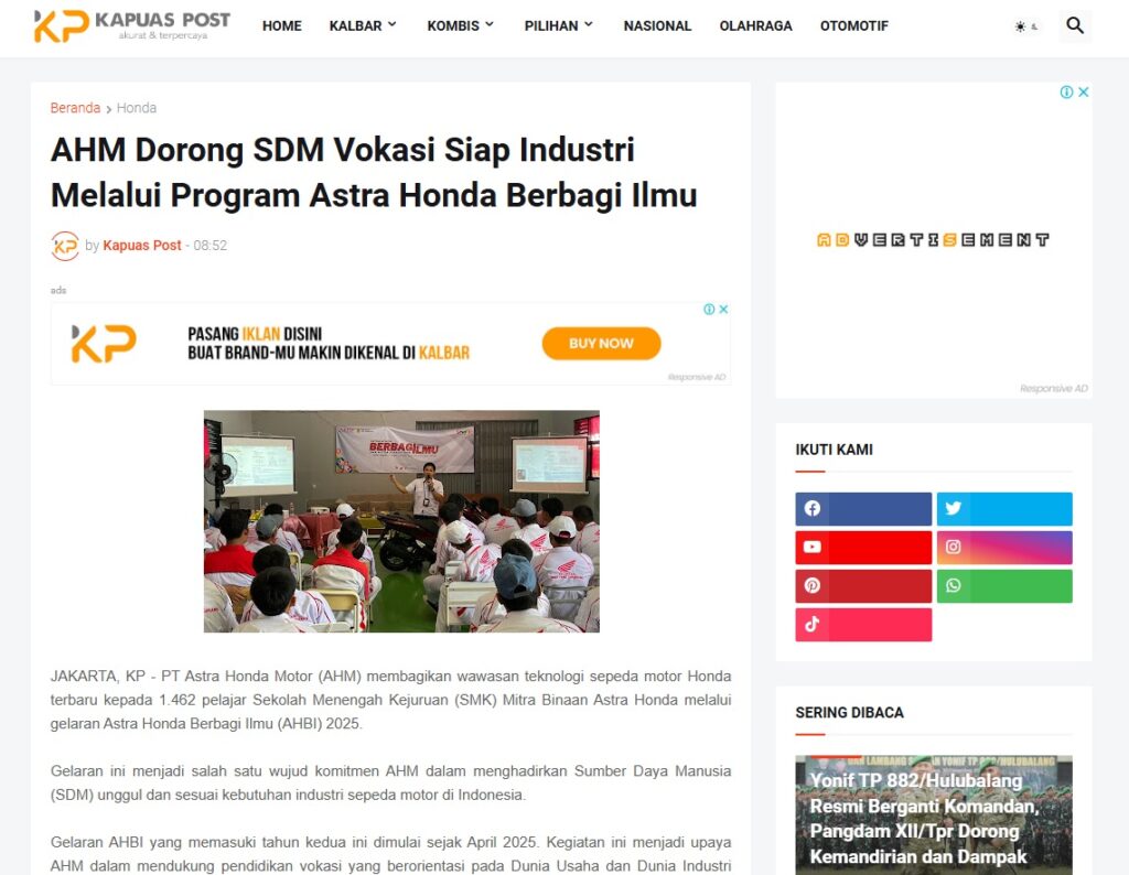 AHM Dorong SDM Vokasi Siap Industri Melalui Program Astra Honda Berbagi Ilmu by Muhammad Arif 27 Januari 2026 in Silahkan kunjungi https://www.kapuaspost.web.id/2026/01/ahm-dorong-sdm-vokasi-siap-industri.html. Tags: astra Astra Motor kalbar Astra Motor Pontianak astramotor honda kalbar pontianak sepeda motor You Might Like Regional Public Launching New ADV160 The SUV Pride Grand Launching New PCX 160 Truly Exceptional! Tetap hati-hati ya bro sist berkendara saat hujan.
