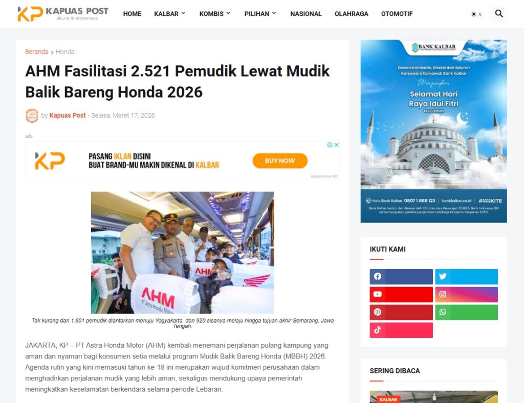 AHM Fasilitasi 2.521 Pemudik Lewat Mudik Balik Bareng Honda 2026 by Muhammad Arif 17 Maret 2026 in Silahkan kunjungi https://www.kapuaspost.web.id/2026/03/ahm-fasilitasi-2521-pemudik-lewat-mudik.html. Tags: astra Astra Motor kalbar Astra Motor Pontianak astramotor honda kalbar pontianak sepeda motor You Might Like Regional Public Launching New ADV160 The SUV Pride Grand Launching New PCX 160 Truly Exceptional! Tetap hati-hati ya bro sist berkendara saat hujan.