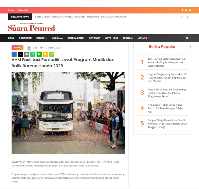 AHM Fasilitasi Pemudik Lewat Program Mudik dan Balik Bareng Honda 2026 by masmul 16 Maret 2026 in Silahkan kunjungi https://www.suarapemredkalbar.com/read/potret/16032026/ahm-fasilitasi-pemudik-lewat-program-mudik-dan-balik-bareng-honda-2026. You Might Like Regional Public Launching New ADV160 The SUV Pride Grand Launching New PCX 160 Truly Exceptional! Tetap hati-hati ya bro sist berkendara saat hujan.
