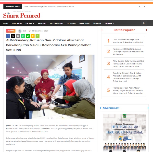 AHM Gandeng Ratusan Gen-Z dalam Aksi Sehat Berkelanjutan Melalui Kolaborasi Aksi Remaja Sehat Satu Hati by masmul 23 November 2025 in Silahkan kunjungi https://www.suarapemredkalbar.com/read/potret/23112025/ahm-gandeng-ratusan-gen-z-dalam-aksi-sehat-berkelanjutan-melalui-kolaborasi-aksi-remaja-sehat-satu-hati. You Might Like Regional Public Launching New ADV160 The SUV Pride Grand Launching New PCX 160 Truly Exceptional! Tetap hati-hati ya bro sist berkendara saat hujan.