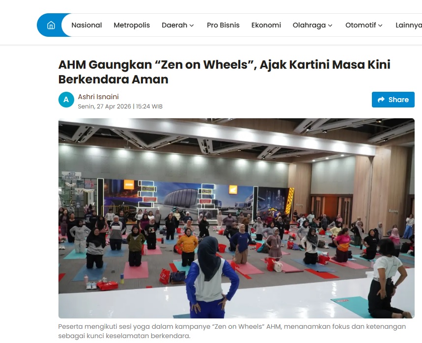 AHM Gaungkan “Zen on Wheels”, Ajak Kartini Masa Kini Berkendara Aman by Aristono Edi Kiswantoro 27 April 2026 in Silahkan kunjungi https://pontianakpost.jawapos.com/otomotif/2604270054/ahm-gaungkan-zen-on-wheels-ajak-kartini-masa-kini-berkendara-aman. You Might Like Regional Public Launching New ADV160 The SUV Pride Grand Launching New PCX 160 Truly Exceptional! Tetap hati-hati ya bro sist berkendara saat hujan.