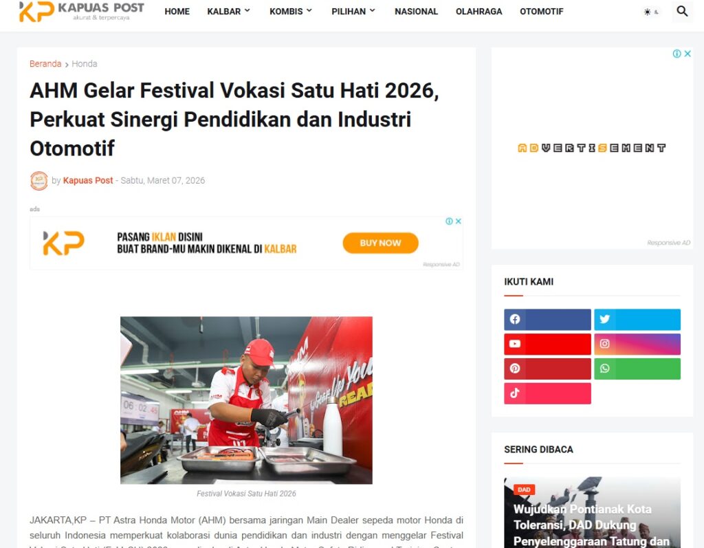 AHM Gelar Festival Vokasi Satu Hati 2026, Perkuat Sinergi Pendidikan dan Industri Otomotif by Muhammad Arif 7 Maret 2026 in Silahkan kunjungi https://www.kapuaspost.web.id/2026/03/ahm-gelar-festival-vokasi-satu-hati_15.html. Tags: astra Astra Motor kalbar Astra Motor Pontianak astramotor honda kalbar pontianak sepeda motor You Might Like Regional Public Launching New ADV160 The SUV Pride Grand Launching New PCX 160 Truly Exceptional! Tetap hati-hati ya bro sist berkendara saat hujan.