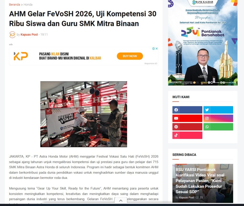 AHM Gelar FeVoSH 2026, Uji Kompetensi 30 Ribu Siswa dan Guru SMK Mitra Binaan by Muhammad Arif 13 November 2025 in Silahkan kunjungi https://www.kapuaspost.web.id/2025/11/ahm-gelar-fevosh-2026-uji-kompetensi-30.html. Tags: astra Astra Motor kalbar Astra Motor Pontianak astramotor honda kalbar pontianak sepeda motor You Might Like Regional Public Launching New ADV160 The SUV Pride Grand Launching New PCX 160 Truly Exceptional! Tetap hati-hati ya bro sist berkendara saat hujan.