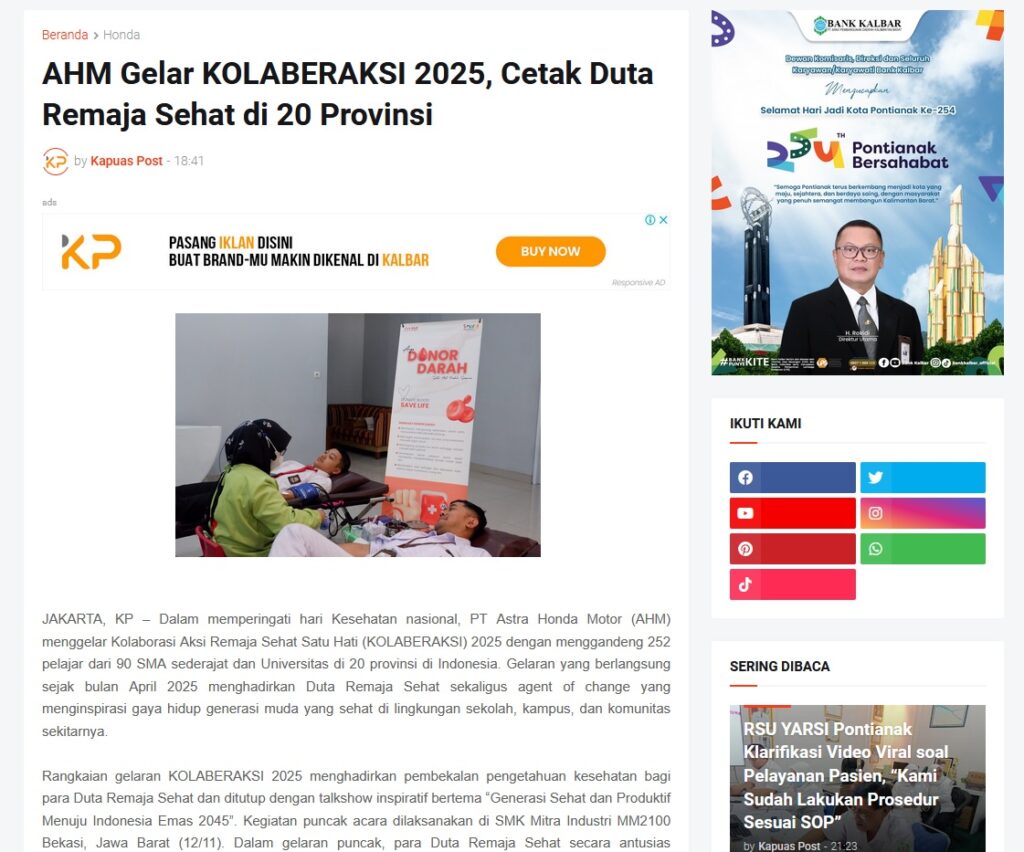 AHM Gelar KOLABERAKSI 2025, Cetak Duta Remaja Sehat di 20 Provinsi by Muhammad Arif 12 November 2025 in Silahkan kunjungi https://www.kapuaspost.web.id/2025/11/ahm-gelar-kolaberaksi-2025-cetak-duta.html. Tags: astra Astra Motor kalbar Astra Motor Pontianak astramotor honda kalbar pontianak sepeda motor You Might Like Regional Public Launching New ADV160 The SUV Pride Grand Launching New PCX 160 Truly Exceptional! Tetap hati-hati ya bro sist berkendara saat hujan.