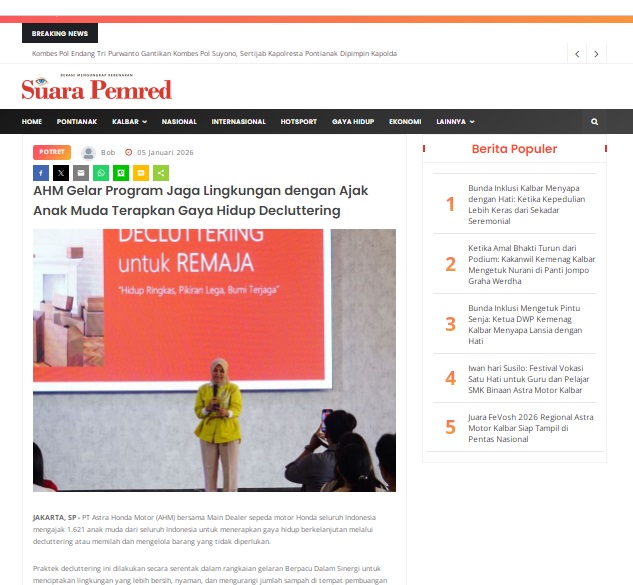 AHM Gelar Program Jaga Lingkungan dengan Ajak Anak Muda Terapkan Gaya Hidup Decluttering by masmul 5 Januari 2026 in Silahkan kunjungi https://www.suarapemredkalbar.com/read/potret/05012026/ahm-gelar-program-jaga-lingkungan-dengan-ajak-anak-muda-terapkan-gaya-hidup-decluttering. You Might Like Regional Public Launching New ADV160 The SUV Pride Grand Launching New PCX 160 Truly Exceptional! Tetap hati-hati ya bro sist berkendara saat hujan.