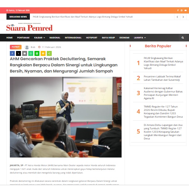 AHM Gencarkan Praktek Decluttering, Semarak Rangkaian Berpacu Dalam Sinergi untuk Lingkungan Bersih, Nyaman, dan Mengurangi Jumlah Sampah by masmul 11 Februari 2026 in Silahkan kunjungi https://www.suarapemredkalbar.com/read/potret/11022026/ahm-gencarkan-praktek-decluttering-semarak-rangkaian-berpacu-dalam-sinergi-untuk-lingkungan-bersih-nyaman-dan-mengurangi-jumlah-sampah. You Might Like Regional Public Launching New ADV160 The SUV Pride Grand Launching New PCX 160 Truly Exceptional! Tetap hati-hati ya bro sist berkendara saat hujan.