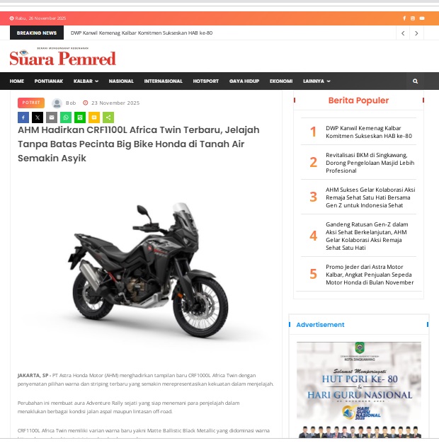 AHM Hadirkan CRF1100L Africa Twin Terbaru, Jelajah Tanpa Batas Pecinta Big Bike Honda di Tanah Air Semakin Asyik by masmul 23 November 2025 in Silahkan kunjungi https://www.suarapemredkalbar.com/read/potret/23112025/ahm-hadirkan-crf1100l-africa-twin-terbaru-jelajah-tanpa-batas-pecinta-big-bike-honda-di-tanah-air-semakin-asyik. You Might Like Regional Public Launching New ADV160 The SUV Pride Grand Launching New PCX 160 Truly Exceptional! Tetap hati-hati ya bro sist berkendara saat hujan.