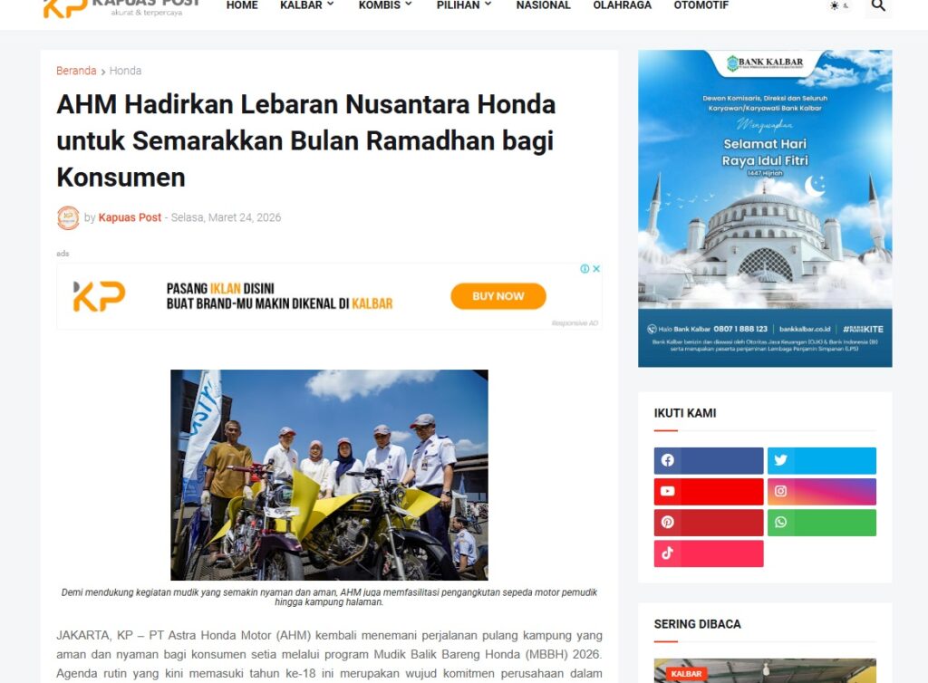 AHM Hadirkan Lebaran Nusantara Honda untuk Semarakkan Bulan Ramadhan bagi Konsumen by Muhammad Arif 24 Maret 2026 in Silahkan kunjungi https://www.kapuaspost.web.id/2026/03/ahm-hadirkan-lebaran-nusantara-honda.html. Tags: astra Astra Motor kalbar Astra Motor Pontianak astramotor honda kalbar pontianak sepeda motor You Might Like Regional Public Launching New ADV160 The SUV Pride Grand Launching New PCX 160 Truly Exceptional! Tetap hati-hati ya bro sist berkendara saat hujan.