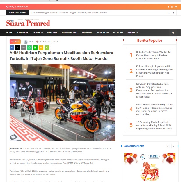 AHM Hadirkan Pengalaman Mobilitas dan Berkendara Terbaik, Ini Tujuh Zona Bematik Booth Motor Honda by masmul 17 Februari 2026 in Silahkan kunjungi https://www.suarapemredkalbar.com/read/potret/17022026/ahm-hadirkan-pengalaman-mobilitas-dan-berkendara-terbaik-ini-tujuh-zona-bematik-booth-motor-honda. You Might Like Regional Public Launching New ADV160 The SUV Pride Grand Launching New PCX 160 Truly Exceptional! Tetap hati-hati ya bro sist berkendara saat hujan.