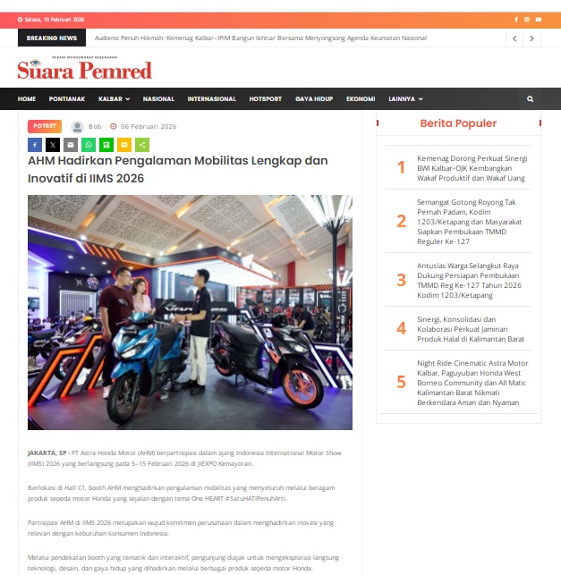 AHM Hadirkan Pengalaman Mobilitas Lengkap dan Inovatif di IIMS 2026 by masmul 6 Februari 2026 in Silahkan kunjungi https://www.suarapemredkalbar.com/read/potret/06022026/ahm-hadirkan-pengalaman-mobilitas-lengkap-dan-inovatif-di-iims-2026. You Might Like Regional Public Launching New ADV160 The SUV Pride Grand Launching New PCX 160 Truly Exceptional! Tetap hati-hati ya bro sist berkendara saat hujan.