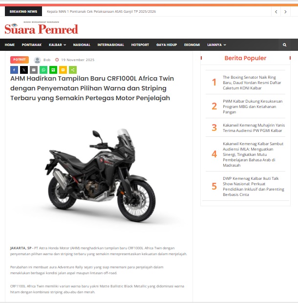 AHM Hadirkan Tampilan Baru CRF1000L Africa Twin dengan Penyematan Pilihan Warna dan Striping Terbaru yang Semakin Pertegas Motor Penjelajah by masmul 19 November 2025 in Silahkan kunjungi https://www.suarapemredkalbar.com/read/potret/19112025/ahm-hadirkan-tampilan-baru-crf1000l-africa-twin-dengan-penyematan-pilihan-warna-dan-striping-terbaru-yang-semakin-pertegas-motor-penjelajah. You Might Like Regional Public Launching New ADV160 The SUV Pride Grand Launching New PCX 160 Truly Exceptional! Tetap hati-hati ya bro sist berkendara saat hujan.