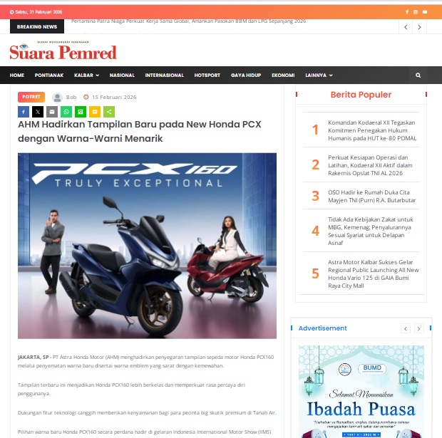 AHM Hadirkan Tampilan Baru pada New Honda PCX dengan Warna-Warni Menarik by masmul 15 Februari 2026 in Silahkan kunjungi https://www.suarapemredkalbar.com/read/potret/15022026/ahm-hadirkan-tampilan-baru-pada-new-honda-pcx-dengan-warna-warni-menarik. You Might Like Regional Public Launching New ADV160 The SUV Pride Grand Launching New PCX 160 Truly Exceptional! Tetap hati-hati ya bro sist berkendara saat hujan.
