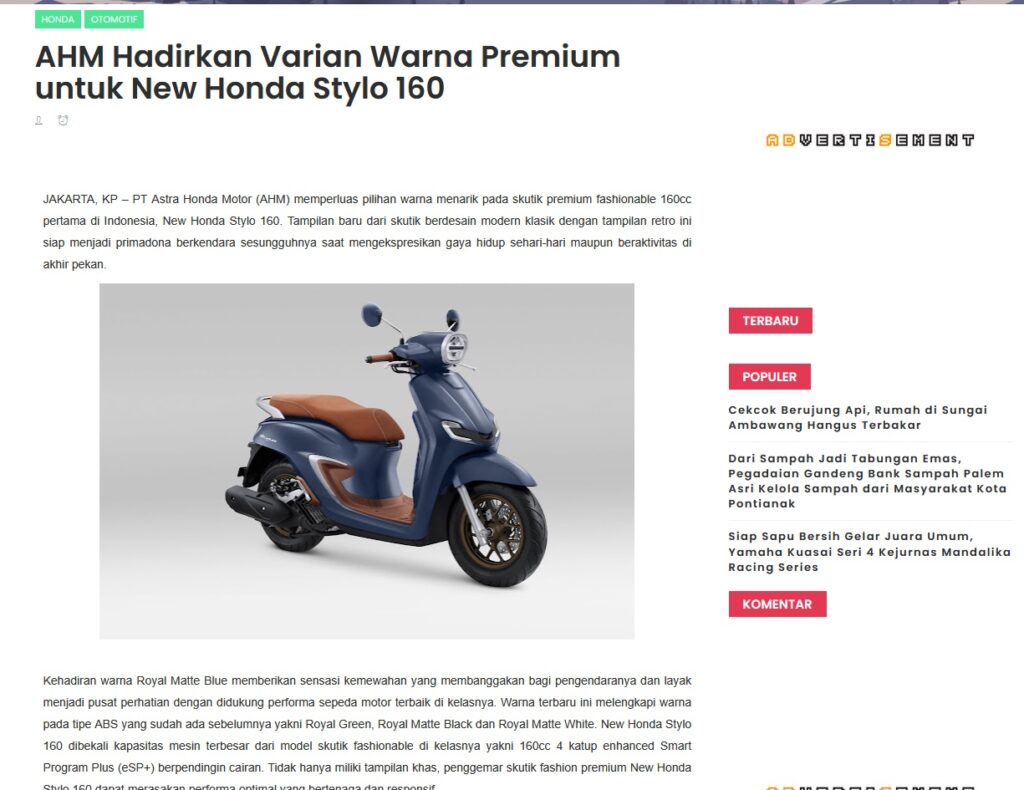 AHM Hadirkan Varian Warna Premium untuk New Honda Stylo 160 by Muhammad Arif 29 September 2025 in Silahkan kunjungi https://www.kapuaspost.web.id/2025/09/ahm-hadirkan-varian-warna-premium-untuk.html. Tags: astra Astra Motor kalbar Astra Motor Pontianak astramotor honda kalbar pontianak sepeda motor You Might Like Regional Public Launching New ADV160 The SUV Pride Grand Launching New PCX 160 Truly Exceptional! Tetap hati-hati ya bro sist berkendara saat hujan.