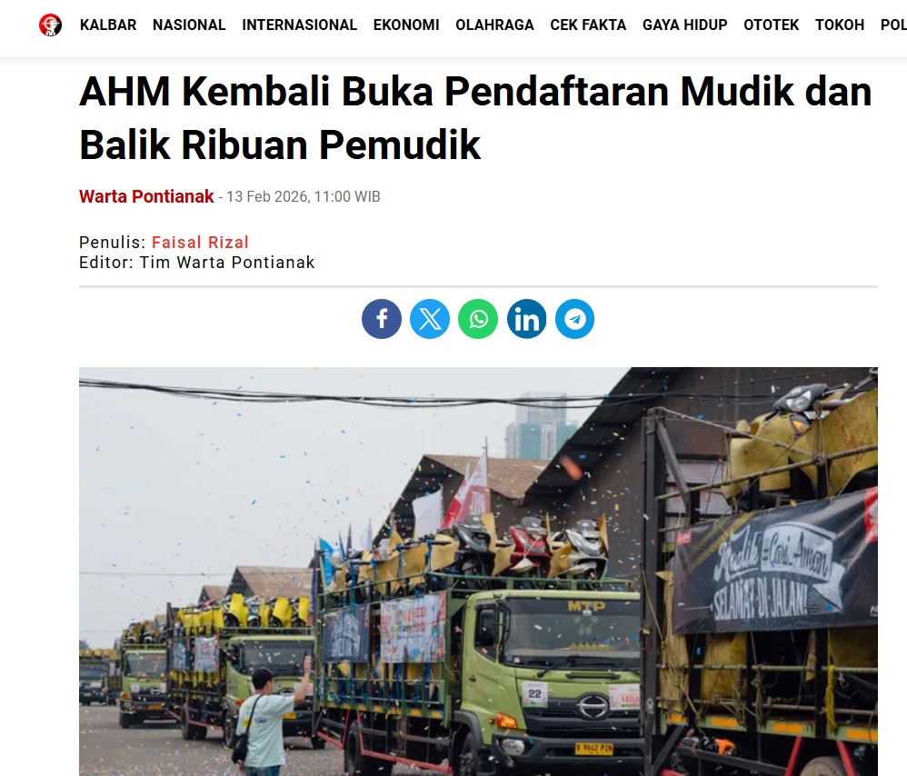 AHM Kembali Buka Pendaftaran Mudik dan Balik Ribuan Pemudik by Faisal Rizal 13 Februari 2026 in Silahkan kunjungi https://wartapontianak.pikiran-rakyat.com/gaya-hidup/pr-11710004991/ahm-kembali-buka-pendaftaran-mudik-dan-balik-ribuan-pemudik. You Might Like Regional Public Launching New ADV160 The SUV Pride Grand Launching New PCX 160 Truly Exceptional! Tetap hati-hati ya bro sist berkendara saat hujan.