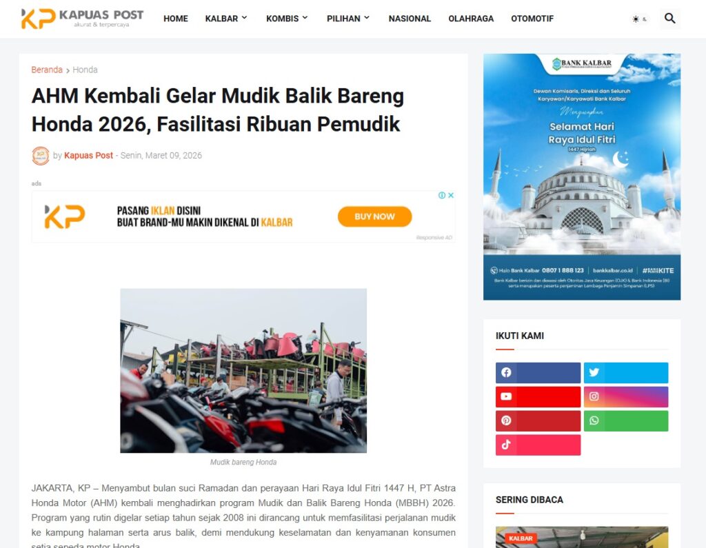 AHM Kembali Gelar Mudik Balik Bareng Honda 2026, Fasilitasi Ribuan Pemudik by Muhammad Arif 9 Maret 2026 in Silahkan kunjungi https://www.kapuaspost.web.id/2026/03/ahm-kembali-gelar-mudik-balik-bareng.html. Tags: astra Astra Motor kalbar Astra Motor Pontianak astramotor honda kalbar pontianak sepeda motor You Might Like Regional Public Launching New ADV160 The SUV Pride Grand Launching New PCX 160 Truly Exceptional! Tetap hati-hati ya bro sist berkendara saat hujan.