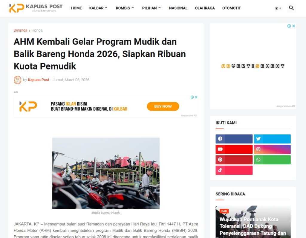 AHM Kembali Gelar Program Mudik dan Balik Bareng Honda 2026, Siapkan Ribuan Kuota Pemudik by Muhammad Arif 6 Maret 2026 in Silahkan kunjungi https://www.kapuaspost.web.id/2026/03/ahm-kembali-gelar-program-mudik-dan.html. Tags: astra Astra Motor kalbar Astra Motor Pontianak astramotor honda kalbar pontianak sepeda motor You Might Like Regional Public Launching New ADV160 The SUV Pride Grand Launching New PCX 160 Truly Exceptional! Tetap hati-hati ya bro sist berkendara saat hujan.