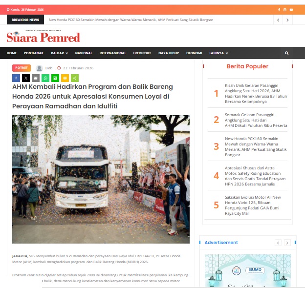 AHM Kembali Hadirkan Program dan Balik Bareng Honda 2026 untuk Apresaiasi Konsumen Loyal di Perayaan Ramadhan dan Idulfiti by masmul 22 Februari 2026 in Silahkan kunjungi https://www.suarapemredkalbar.com/read/potret/22022026/ahm-kembali-hadirkan-programdan-balik-bareng-honda-2026-untuk-apresaiasi-konsumen-loyal-di-perayaan-ramadhan-dan-idulfiti. You Might Like Regional Public Launching New ADV160 The SUV Pride Grand Launching New PCX 160 Truly Exceptional! Tetap hati-hati ya bro sist berkendara saat hujan.
