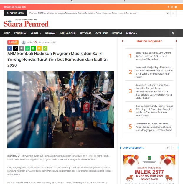 AHM kembali Hadirkan Program Mudik dan Balik Bareng Honda, Turut Sambut Ramadan dan Idulfitri 2026 by masmul 18 Februari 2026 in Silahkan kunjungi https://www.suarapemredkalbar.com/read/potret/18022026/ahm-kembali-hadirkan-program-mudik-dan-balik-bareng-honda-turut-sambut-ramadan-dan-idulfitri-2026. You Might Like Regional Public Launching New ADV160 The SUV Pride Grand Launching New PCX 160 Truly Exceptional! Tetap hati-hati ya bro sist berkendara saat hujan.