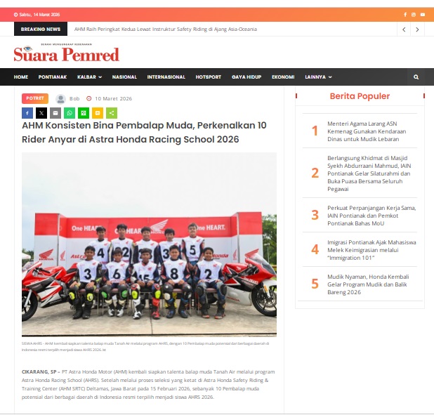 AHM Konsisten Bina Pembalap Muda, Perkenalkan 10 Rider Anyar di Astra Honda Racing School 2026 by masmul 10 Maret 2026 in Silahkan kunjungi https://www.suarapemredkalbar.com/read/potret/10032026/ahm-konsisten-bina-pembalap-muda-perkenalkan-10-rider-anyar-di-astra-honda-racing-school-2026. You Might Like Regional Public Launching New ADV160 The SUV Pride Grand Launching New PCX 160 Truly Exceptional! Tetap hati-hati ya bro sist berkendara saat hujan.