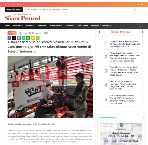 AHM Konsisten Gelar Festival Vokasi Satu Hati untuk Guru dan Pelajar 715 SMK Mitra Binaan Astra Honda di Seluruh Indonesia by masmul 28 November 2025 in Silahkan kunjungi https://www.suarapemredkalbar.com/read/potret/28112025/ahm-konsisten-gelar-festival-vokasi-satu-hati-untuk-guru-dan-pelajar-715-smk-mitra-binaan-astra-honda-di-seluruh-indonesia. You Might Like Regional Public Launching New ADV160 The SUV Pride Grand Launching New PCX 160 Truly Exceptional! Tetap hati-hati ya bro sist berkendara saat hujan.