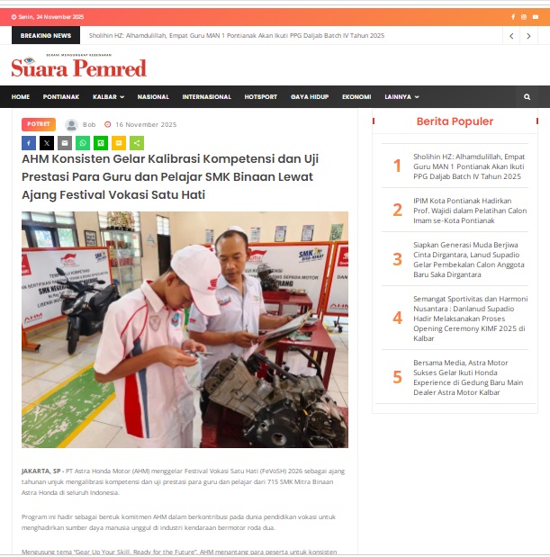 AHM Konsisten Gelar Kalibrasi Kompetensi dan Uji Prestasi Para Guru dan Pelajar SMK Binaan Lewat Ajang Festival Vokasi Satu Hati by masmul 16 November 2025 in Silahkan kunjungi https://www.suarapemredkalbar.com/read/potret/16112025/ahm-konsisten-gelar-kalibrasi-kompetensi-dan-uji-prestasi-para-guru-dan-pelajar-smk-binaan-lewat-ajang-festival-vokasi-satu-hati. You Might Like Regional Public Launching New ADV160 The SUV Pride Grand Launching New PCX 160 Truly Exceptional! Tetap hati-hati ya bro sist berkendara saat hujan.
