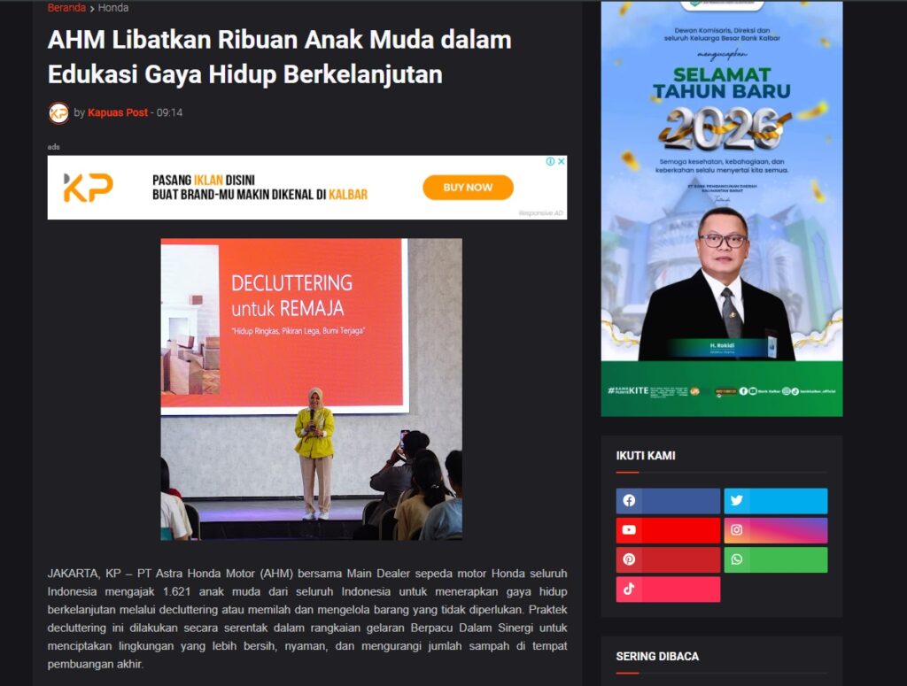 AHM Libatkan Ribuan Anak Muda dalam Edukasi Gaya Hidup Berkelanjutan by Muhammad Arif 6 Januari 2026 in Silahkan kunjungi https://www.kapuaspost.web.id/2026/01/ahm-libatkan-ribuan-anak-muda-dalam.html. Tags: astra Astra Motor kalbar Astra Motor Pontianak astramotor honda kalbar pontianak sepeda motor You Might Like Regional Public Launching New ADV160 The SUV Pride Grand Launching New PCX 160 Truly Exceptional! Tetap hati-hati ya bro sist berkendara saat hujan.