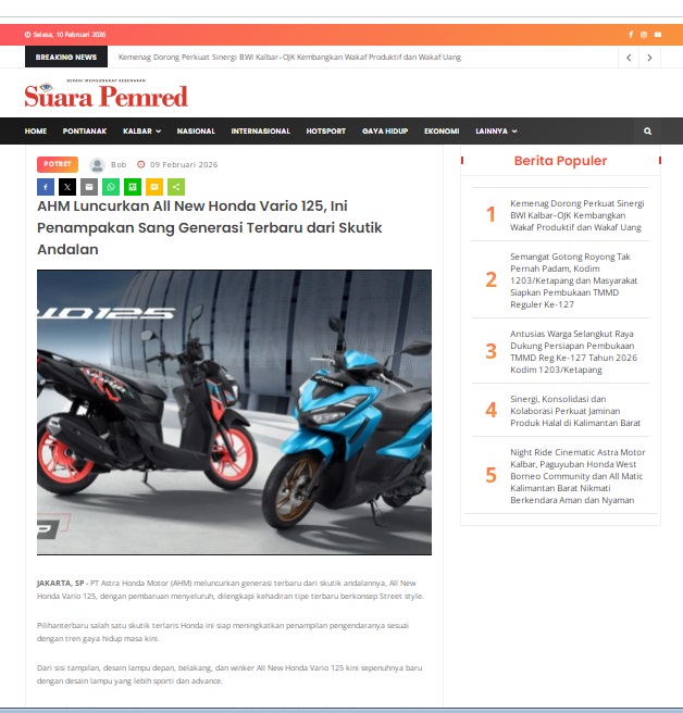 AHM Luncurkan All New Honda Vario 125, Ini Penampakan Sang Generasi Terbaru dari Skutik Andalan by masmul 9 Februari 2026 in Silahkan kunjungi https://www.suarapemredkalbar.com/read/potret/09022026/ahm-luncurkan-all-new-honda-vario-125-ini-penampakan-sang-generasi-terbaru-dari-skutik-andalan. You Might Like Regional Public Launching New ADV160 The SUV Pride Grand Launching New PCX 160 Truly Exceptional! Tetap hati-hati ya bro sist berkendara saat hujan.