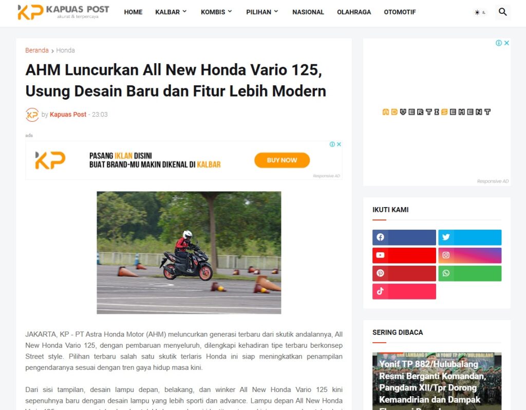 AHM Luncurkan All New Honda Vario 125, Usung Desain Baru dan Fitur Lebih Modern by Muhammad Arif 24 Januari 2026 in Silahkan kunjungi https://www.kapuaspost.web.id/2026/01/ahm-luncurkan-all-new-honda-vario-125_28.html. Tags: astra Astra Motor kalbar Astra Motor Pontianak astramotor honda kalbar pontianak sepeda motor You Might Like Regional Public Launching New ADV160 The SUV Pride Grand Launching New PCX 160 Truly Exceptional! Tetap hati-hati ya bro sist berkendara saat hujan.