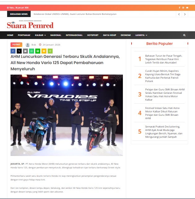 AHM Luncurkan Generasi Terbaru Skutik Andalannya, All New Honda Vario 125 Dapat Pembaharuan Menyeluruh by masmul 24 Januari 2026 in Silahkan kunjungi https://www.suarapemredkalbar.com/read/potret/24012026/ahm-luncurkan-generasi-terbaru-skutik-andalannya-all-new-honda-vario-125-dapat-pembaharuan-menyeluruh. You Might Like Regional Public Launching New ADV160 The SUV Pride Grand Launching New PCX 160 Truly Exceptional! Tetap hati-hati ya bro sist berkendara saat hujan.