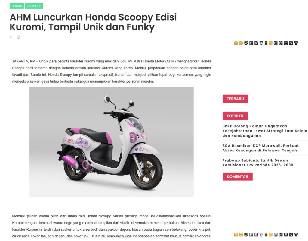 AHM Luncurkan Honda Scoopy Edisi Kuromi, Tampil Unik dan Funky by Muhammad Arif 10 Oktober 2025 in Silahkan kunjungi https://www.kapuaspost.web.id/2025/10/ahm-luncurkan-honda-scoopy-edisi-kuromi.html. Tags: astra Astra Motor kalbar Astra Motor Pontianak astramotor honda kalbar pontianak sepeda motor You Might Like Regional Public Launching New ADV160 The SUV Pride Grand Launching New PCX 160 Truly Exceptional! Tetap hati-hati ya bro sist berkendara saat hujan.
