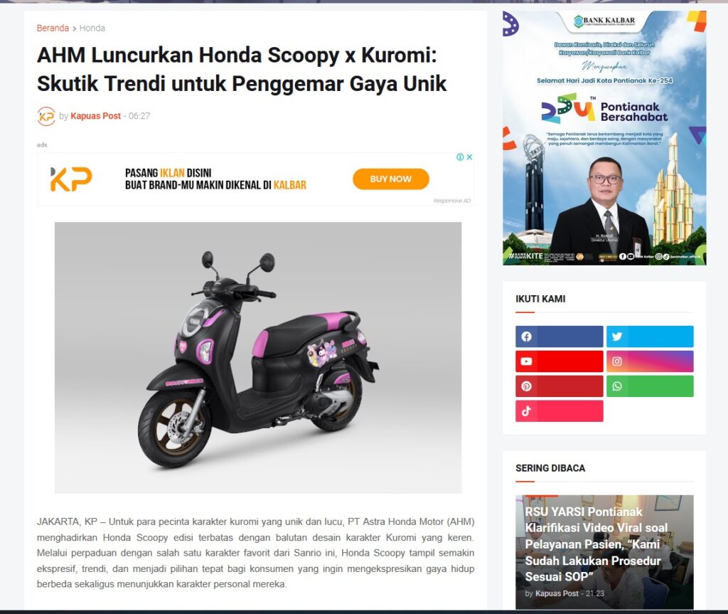 AHM Luncurkan Honda Scoopy x Kuromi: Skutik Trendi untuk Penggemar Gaya Unik by Muhammad Arif 5 November 2025 in Silahkan kunjungi https://www.kapuaspost.web.id/2025/11/ahm-luncurkan-honda-scoopy-x-kuromi.html. Tags: astra Astra Motor kalbar Astra Motor Pontianak astramotor honda kalbar pontianak sepeda motor You Might Like Regional Public Launching New ADV160 The SUV Pride Grand Launching New PCX 160 Truly Exceptional! Tetap hati-hati ya bro sist berkendara saat hujan.