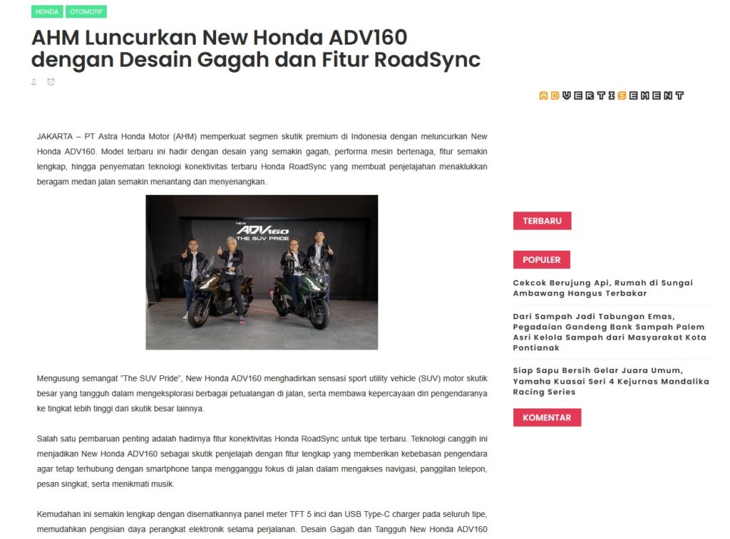AHM Luncurkan New Honda ADV160 dengan Desain Gagah dan Fitur RoadSync by Muhammad Arif 21 September 2025 in Silahkan kunjungi https://www.kapuaspost.web.id/2025/09/ahm-luncurkan-new-honda-adv160-dengan.html. Tags: astra Astra Motor kalbar Astra Motor Pontianak astramotor honda kalbar pontianak sepeda motor You Might Like Regional Public Launching New ADV160 The SUV Pride Grand Launching New PCX 160 Truly Exceptional! Tetap hati-hati ya bro sist berkendara saat hujan.