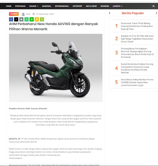 AHM Perbaharui New Honda ADV160 dengan Banyak Pilihan Warna Menarik by masmul 15 September 2025 in Silahkan kunjungi https://www.suarapemredkalbar.com/read/potret/15092025/ahm-perbaharui-new-honda-adv160-dengan-banyak-pilihan-warna-menarik. You Might Like Regional Public Launching New ADV160 The SUV Pride Grand Launching New PCX 160 Truly Exceptional! Tetap hati-hati ya bro sist berkendara saat hujan.