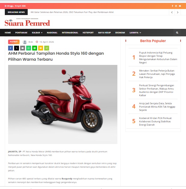 AHM Perbarui Tampilan Honda Stylo 160 dengan Pilihan Warna Terbaru by masmul 16 April 2026 in Silahkan kunjungi https://www.suarapemredkalbar.com/read/potret/16042026/ahm-perbarui-tampilan-honda-stylo-160-dengan-pilihan-warna-terbaru. You Might Like Regional Public Launching New ADV160 The SUV Pride Grand Launching New PCX 160 Truly Exceptional! Tetap hati-hati ya bro sist berkendara saat hujan.