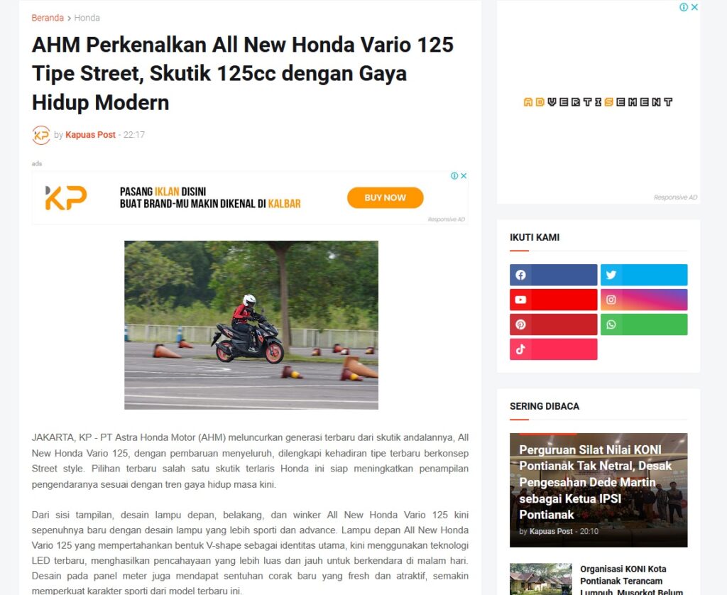 AHM Perkenalkan All New Honda Vario 125 Tipe Street, Skutik 125cc dengan Gaya Hidup Modern by Muhammad Arif 21 Desember 2025 in Silahkan kunjungi https://www.kapuaspost.web.id/2025/12/ahm-perkenalkan-all-new-honda-vario-125.html. Tags: astra Astra Motor kalbar Astra Motor Pontianak astramotor honda kalbar pontianak sepeda motor You Might Like Regional Public Launching New ADV160 The SUV Pride Grand Launching New PCX 160 Truly Exceptional! Tetap hati-hati ya bro sist berkendara saat hujan.