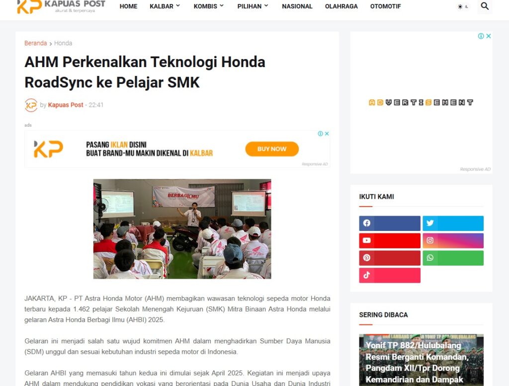 AHM Perkenalkan Teknologi Honda RoadSync ke Pelajar SMK by Muhammad Arif 25 Januari 2026 in Silahkan kunjungi https://www.kapuaspost.web.id/2026/01/ahm-perkenalkan-teknologi-honda-roadsync.html. Tags: astra Astra Motor kalbar Astra Motor Pontianak astramotor honda kalbar pontianak sepeda motor You Might Like Regional Public Launching New ADV160 The SUV Pride Grand Launching New PCX 160 Truly Exceptional! Tetap hati-hati ya bro sist berkendara saat hujan.