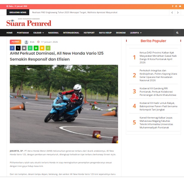 AHM Perkuat Dominasi, All New Honda Vario 125 Semakin Responsif dan Efisien by masmul 17 Januari 2026 in Silahkan kunjungi https://www.suarapemredkalbar.com/read/potret/17012026/ahm-perkuat-dominasi-all-new-honda-vario-125-semakin-responsif-dan-efisien. You Might Like Regional Public Launching New ADV160 The SUV Pride Grand Launching New PCX 160 Truly Exceptional! Tetap hati-hati ya bro sist berkendara saat hujan.