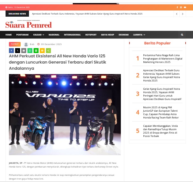 AHM Perkuat Eksistensi All New Honda Vario 125 dengan Luncurkan Generasi Terbaru dari Skutik Andalannya by masmul 9 Desember 2025 in Silahkan kunjungi https://www.suarapemredkalbar.com/read/potret/09122025/ahm-perkuat-eksistensi-all-new-honda-vario-125-dengan-luncurkan-generasi-terbaru-dari-skutik-andalannya. You Might Like Regional Public Launching New ADV160 The SUV Pride Grand Launching New PCX 160 Truly Exceptional! Tetap hati-hati ya bro sist berkendara saat hujan.