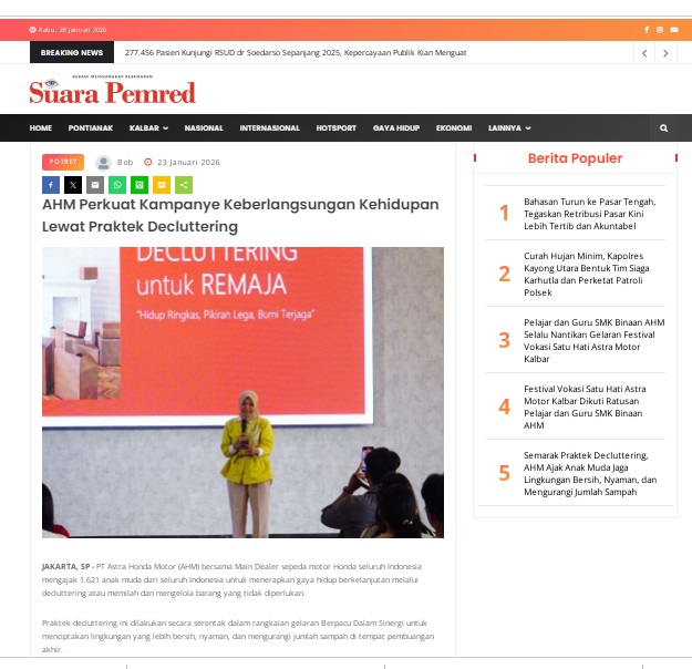 AHM Perkuat Kampanye Keberlangsungan Kehidupan Lewat Praktek Decluttering by masmul 23 Januari 2026 in Silahkan kunjungi https://www.suarapemredkalbar.com/read/potret/23012026/ahm-perkuat-kampanye-keberlangsungan-kehidupan-lewat-praktek-decluttering. You Might Like Regional Public Launching New ADV160 The SUV Pride Grand Launching New PCX 160 Truly Exceptional! Tetap hati-hati ya bro sist berkendara saat hujan.