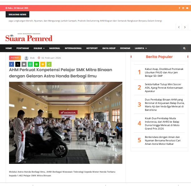 AHM Perkuat Konpetensi Pelajar SMK Mitra Binaan dengan Gelaran Astra Honda Berbagi Ilmu by masmul 2 Februari 2026 in Silahkan kunjungi https://www.suarapemredkalbar.com/read/potret/02022026/ahm-perkuat-konpetensi-pelajar-smk-mitra-binaan-dengan-gelaran-astra-honda-berbagi-ilmu. You Might Like Regional Public Launching New ADV160 The SUV Pride Grand Launching New PCX 160 Truly Exceptional! Tetap hati-hati ya bro sist berkendara saat hujan.