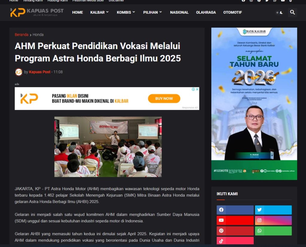 AHM Perkuat Pendidikan Vokasi Melalui Program Astra Honda Berbagi Ilmu 2025 by Muhammad Arif 3 Januari 2026 in Silahkan kunjungi https://www.kapuaspost.web.id/2026/01/ahm-perkuat-pendidikan-vokasi-melalui.html. Tags: astra Astra Motor kalbar Astra Motor Pontianak astramotor honda kalbar pontianak sepeda motor You Might Like Regional Public Launching New ADV160 The SUV Pride Grand Launching New PCX 160 Truly Exceptional! Tetap hati-hati ya bro sist berkendara saat hujan.