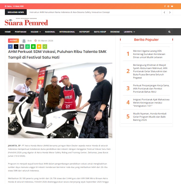 AHM Perkuat SDM Vokasi, Puluhan Ribu Talenta SMK Tampil di Festival Satu Hati by masmul 5 Maret 2026 in Silahkan kunjungi https://www.suarapemredkalbar.com/read/potret/05032026/ahm-perkuat-sdm-vokasi-puluhan-ribu-talenta-smk-tampil-di-festival-satu-hati. You Might Like Regional Public Launching New ADV160 The SUV Pride Grand Launching New PCX 160 Truly Exceptional! Tetap hati-hati ya bro sist berkendara saat hujan.