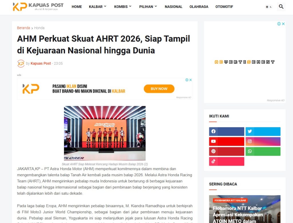 AHM Perkuat Skuat AHRT 2026, Siap Tampil di Kejuaraan Nasional hingga Dunia by Muhammad Arif 6 Februari 2026 in Silahkan kunjungi https://www.kapuaspost.web.id/2026/02/ahm-perkuat-skuat-ahrt-2026-siap-tampil.html. Tags: astra Astra Motor kalbar Astra Motor Pontianak astramotor honda kalbar pontianak sepeda motor You Might Like Regional Public Launching New ADV160 The SUV Pride Grand Launching New PCX 160 Truly Exceptional! Tetap hati-hati ya bro sist berkendara saat hujan.