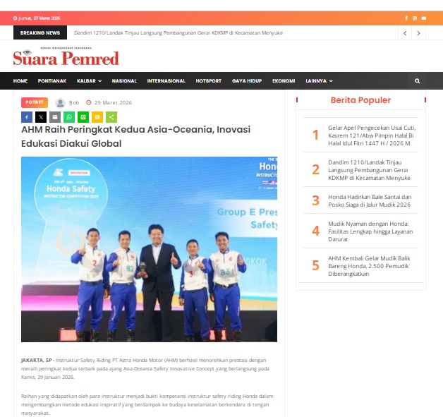 AHM Raih Peringkat Kedua Asia-Oceania, Inovasi Edukasi Diakui Global by masmul 25 Maret 2026 in Silahkan kunjungi https://www.suarapemredkalbar.com/read/potret/25032026/ahm-raih-peringkat-kedua-asia-oceania-inovasi-edukasi-diakui-global. You Might Like Regional Public Launching New ADV160 The SUV Pride Grand Launching New PCX 160 Truly Exceptional! Tetap hati-hati ya bro sist berkendara saat hujan.