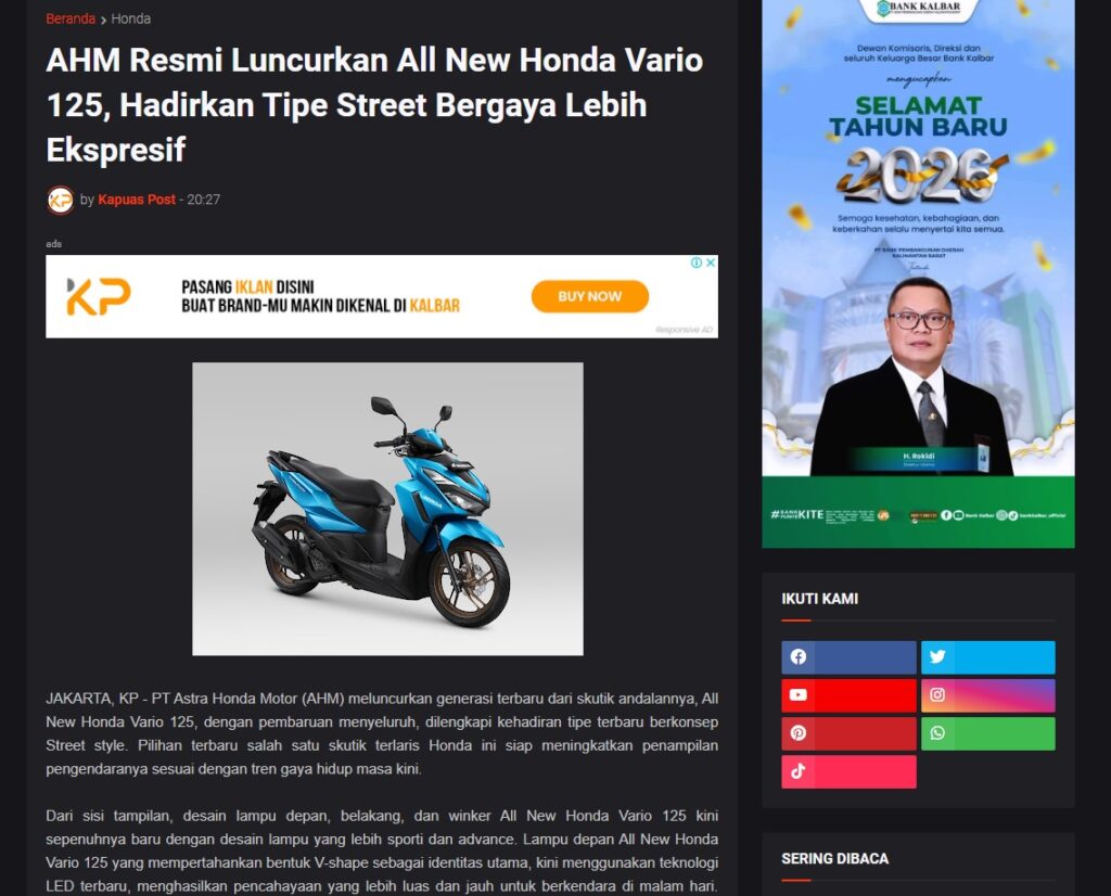 AHM Resmi Luncurkan All New Honda Vario 125, Hadirkan Tipe Street Bergaya Lebih Ekspresif by Muhammad Arif 1 Januari 2026 in Silahkan kunjungi https://www.kapuaspost.web.id/2026/01/ahm-resmi-luncurkan-all-new-honda-vario.html. Tags: astra Astra Motor kalbar Astra Motor Pontianak astramotor honda kalbar pontianak sepeda motor You Might Like Regional Public Launching New ADV160 The SUV Pride Grand Launching New PCX 160 Truly Exceptional! Tetap hati-hati ya bro sist berkendara saat hujan.