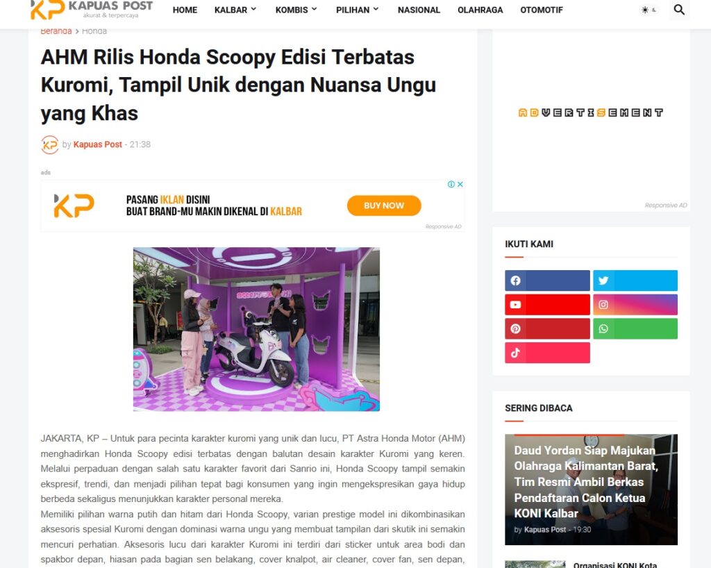AHM Rilis Honda Scoopy Edisi Terbatas Kuromi, Tampil Unik dengan Nuansa Ungu yang Khas by Muhammad Arif 18 November 2025 in Silahkan kunjungi https://www.kapuaspost.web.id/2025/11/ahm-rilis-honda-scoopy-edisi-terbatas.html. Tags: astra Astra Motor kalbar Astra Motor Pontianak astramotor honda kalbar pontianak sepeda motor You Might Like Regional Public Launching New ADV160 The SUV Pride Grand Launching New PCX 160 Truly Exceptional! Tetap hati-hati ya bro sist berkendara saat hujan.