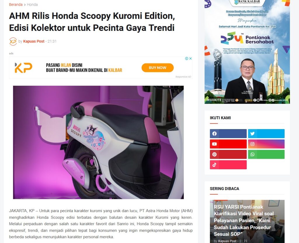 AHM Rilis Honda Scoopy Kuromi Edition, Edisi Kolektor untuk Pecinta Gaya Trendi by Muhammad Arif 20 Oktober 2025 in Silahkan kunjungi https://www.kapuaspost.web.id/2025/10/ahm-rilis-honda-scoopy-kuromi-edition.html. Tags: astra Astra Motor kalbar Astra Motor Pontianak astramotor honda kalbar pontianak sepeda motor You Might Like Regional Public Launching New ADV160 The SUV Pride Grand Launching New PCX 160 Truly Exceptional! Tetap hati-hati ya bro sist berkendara saat hujan.