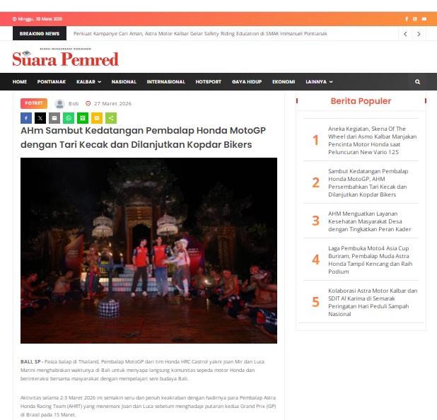 AHM Sambut Kedatangan Pembalap Honda MotoGP dengan Tari Kecak dan Dilanjutkan Kopdar Bikers by masmul 27 Maret 2026 in Silahkan kunjungi https://www.suarapemredkalbar.com/read/potret/27032026/ahm-sambut-kedatangan-pembalap-honda-motogp-dengan-tari-kecak-dan-dilanjutkan-kopdar-bikers. You Might Like Regional Public Launching New ADV160 The SUV Pride Grand Launching New PCX 160 Truly Exceptional! Tetap hati-hati ya bro sist berkendara saat hujan.
